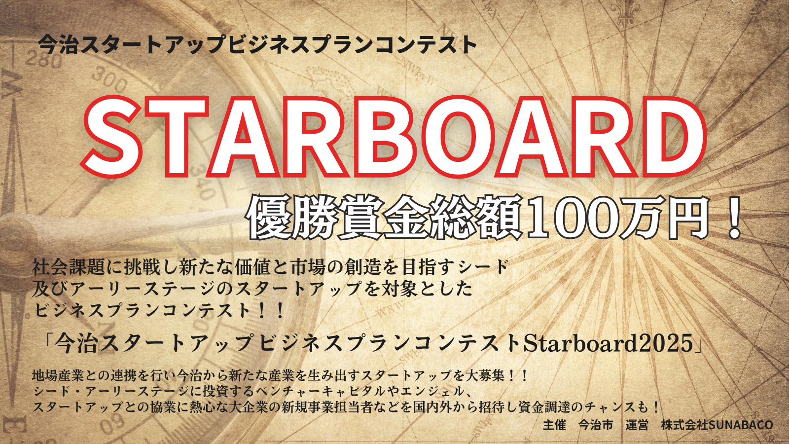 今治発あたらしいビジネスプランコンテスト「Starboard」 今治の地場産業である海事・タオルそして、しまなみ海道を中心とした観光産業や農業などと連携しあたらしい価値を提供するスタートアップを大募集!